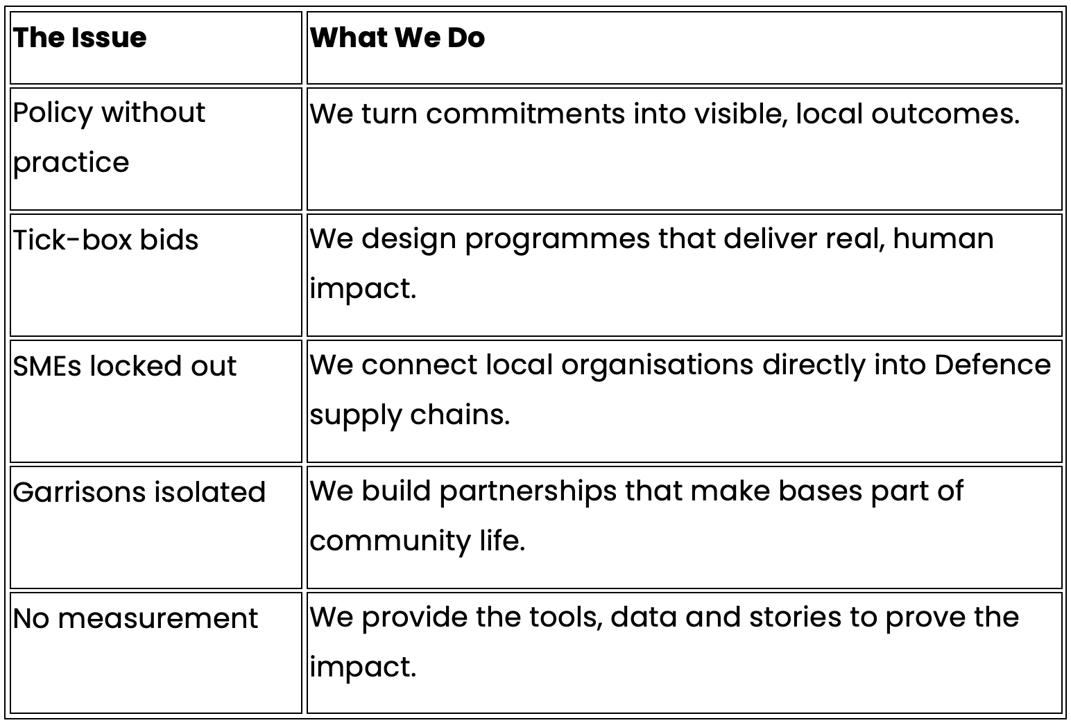 3. SMEs and Local Partners Shut Out: Small organisations who are closest to the community but in reality face the highest barriers getting into Defence supply chains.